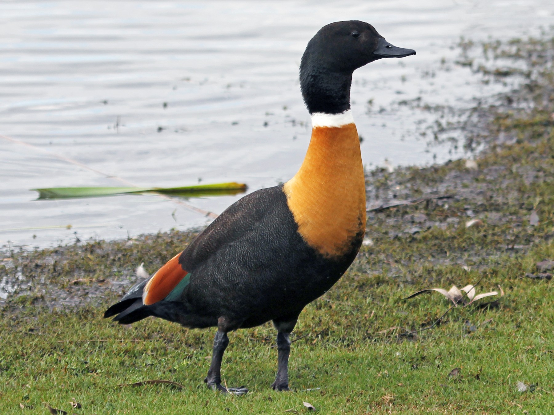 The Australian Shelduck is a big, brightly colored duck with a small head and bill. The male head and neck are black, tinged green, with a white neck ring and infrequently a white ring around the bottom of the bill.