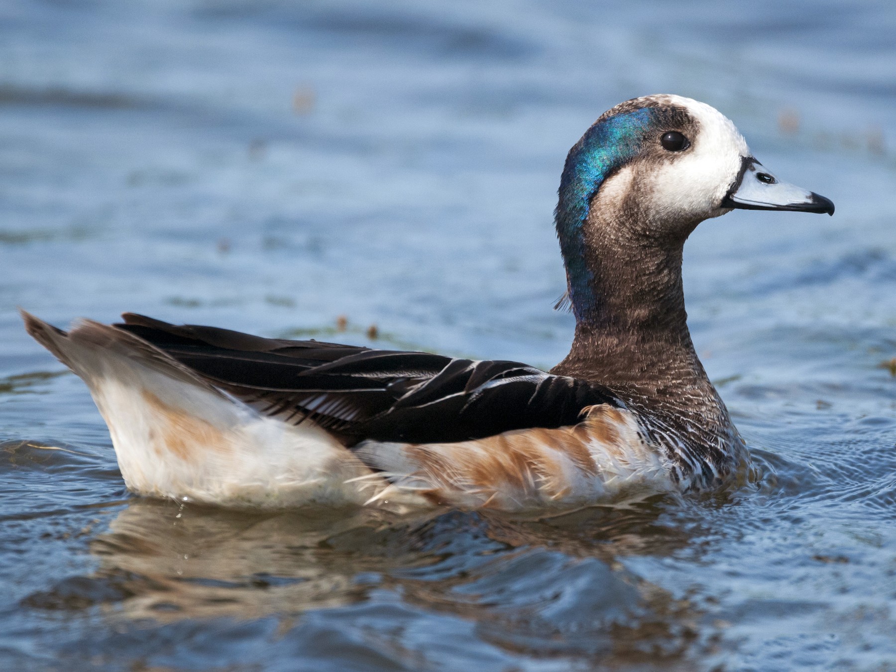 This Chiloe wigeon has an iridescent green-blue cap on its head and a bluish-gray bill with a black tip. The cheeks and brow are white, the eyes are darkish brown, and there’s a white auricular patch.