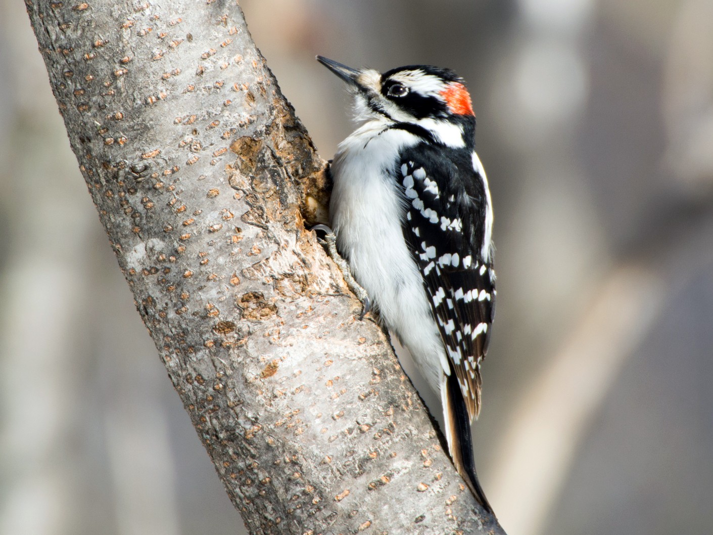Hairy and Downy woodpeckers happen collectively all through most of their ranges. The Downy Woodpecker makes use of smaller branches whereas the Hairy Woodpecker tends to spend more time on trunks.