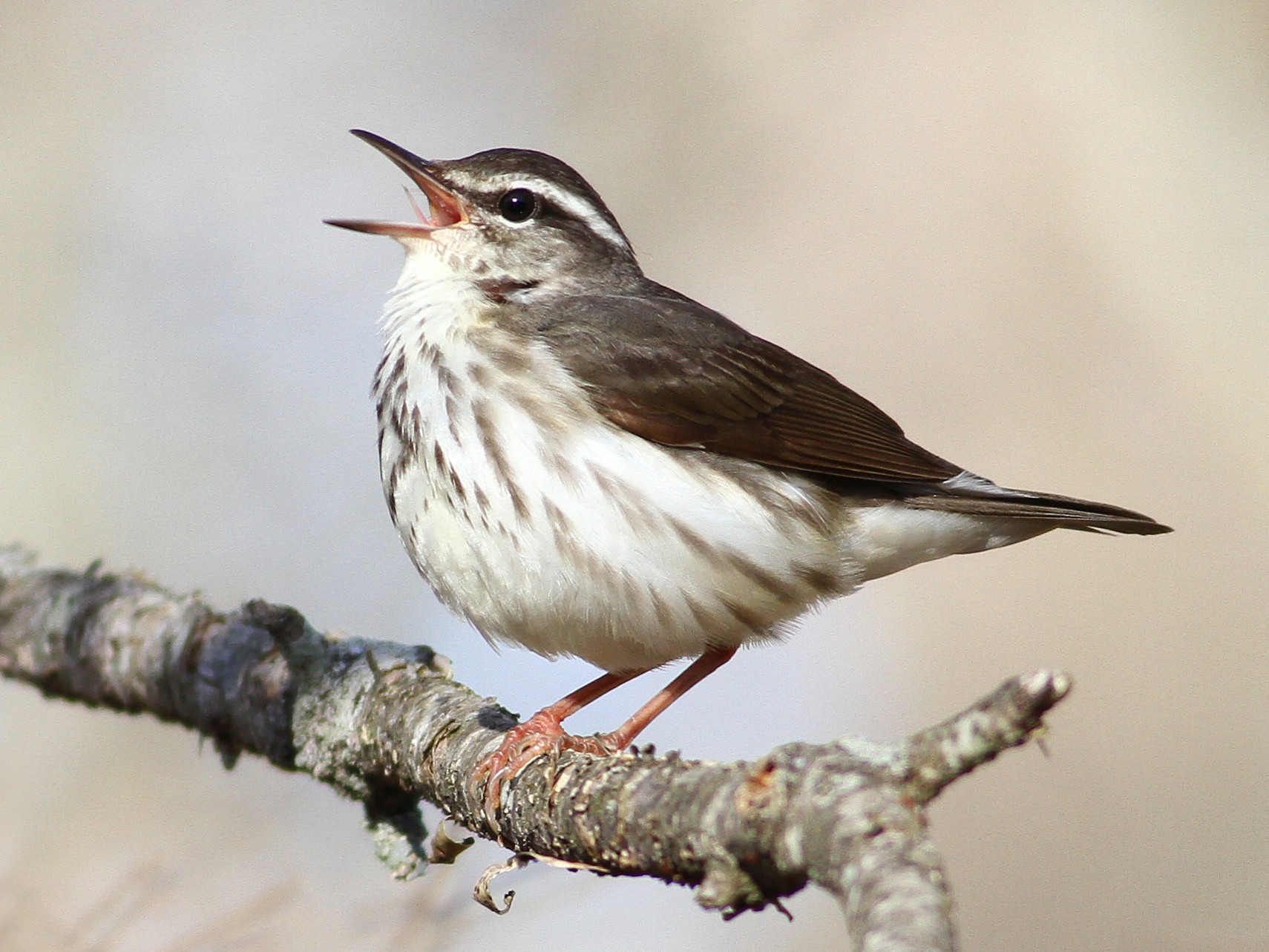 Brownish above, with a really distinguished white eyebrow (supercilium); pale under, with darkish streaks. The supercilium is thicker in Louisiana than in ​Northern and tends to flare on the rear. The legs are brilliant pink.