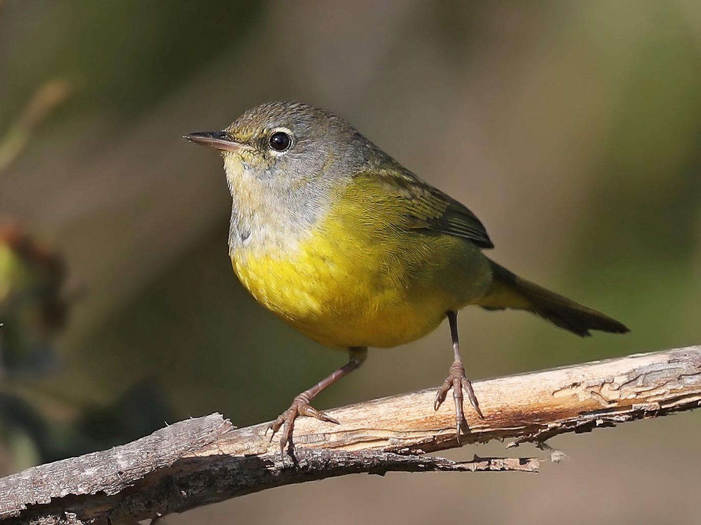 Adult MacGillivray’s warblers are an olive-green coloration on their upper parts and boring yellow under. Males have blackheads and breasts, whereas females and immature birds have drab light grey heads; each male and females have damaged white eye-rings.