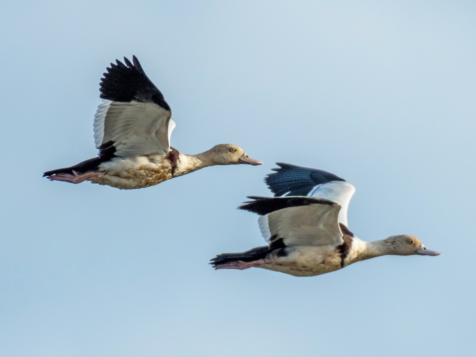 The Radjah Shelduck is white with a chestnut band throughout its chest. Its wingtips, back, rump and tail are black whereas green and russet patches could also be seen in a definite pattern alongside its prolonged wings.