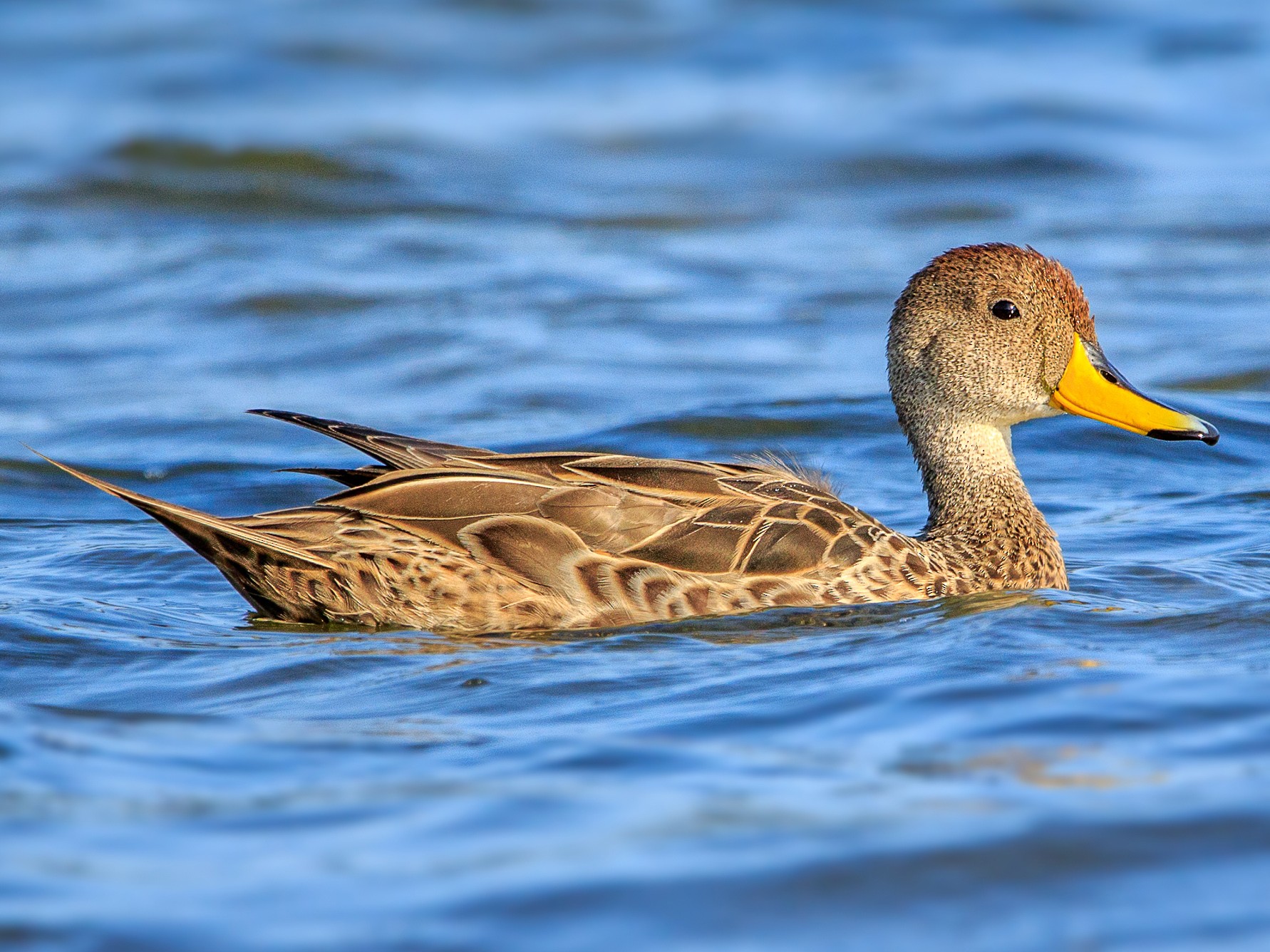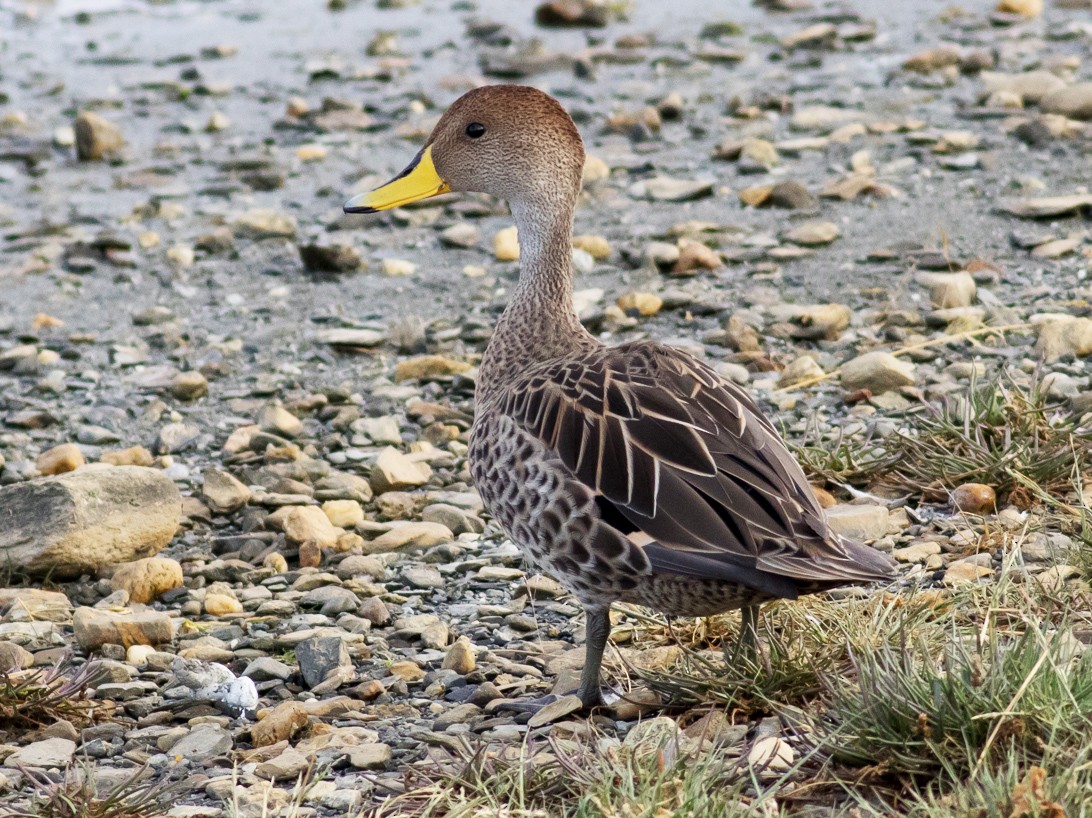 The yellow-billed pintail has a brown head and neck. The bill is yellow with a black tip and a black stripe down the center. The tail is brownish and pointed.